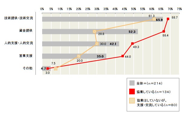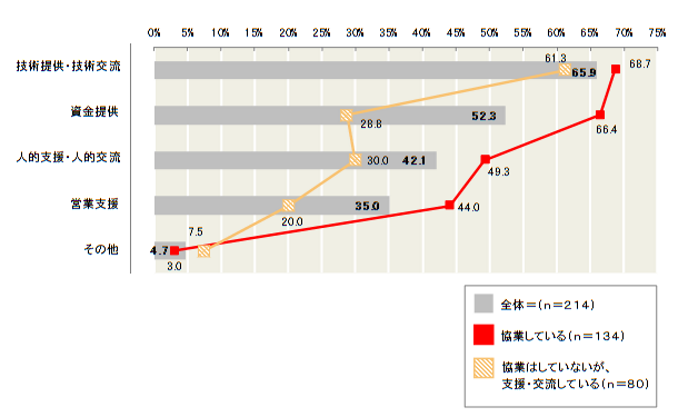 ○ 協業状況別でみると、協業している企業における具体的な協業内容は、「技術提供・技術交流」、「資金提供」、「人的支援・人的交流」、「営業支援」と、さまざまであり、支援・交流している企業の支援内容は、「技術提供・技術交流」が主であることがわかりました【図2-2】。