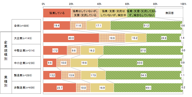 ○ 協業・支援・交流の理由を見ると、大企業と中小企業を比較して、大企業の方が高かったものは、「オープンイノベーションの推進」(大企業56.1%、中小企業21.1%、差異35ポイント)、「自社にない先進技術の獲得」(大企業64.5%、中小企業35.6%、差異28.9ポイント)でした。他方、中小企業の方が高かったのは、「販路拡大」(大企業11.2%、中小企業34.4%、差異23.2ポイント)となっています。「オープンイノベーションの推進」は、中堅企業では40.7%であり、リソース獲得という目標に加えて、企業規模が大きくなるにつれてイノベーションを起こすための推進施策にも目が向けられていると思われます。