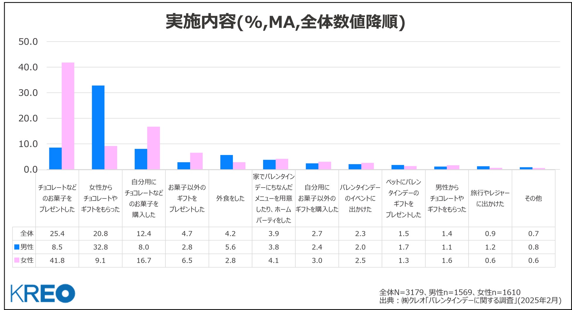 実施内容としては、「チョコレートなどのお菓子をプレゼントした」(25.4%)が最も多く、次いで「女性からチョコレートやギフトをもらった」(20.8%)、「自分用にチョコレートなどのお菓子を購入した」(12.4%)という結果になりました。