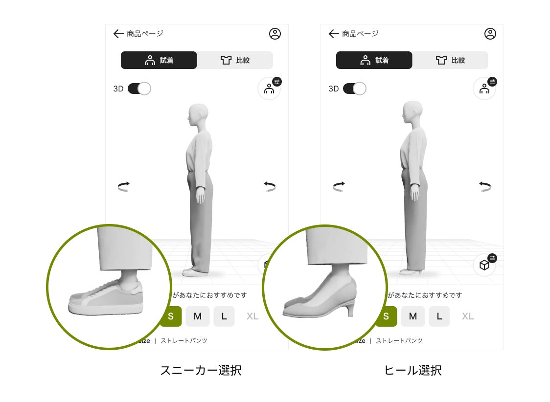 従来の2D表示では裸足でのシルエットでしたが、3Dシルエットでは靴を履いた状態での着用イメージが確認できるようになりました。3Dモデルの靴はスニーカーからヒールへの変更も可能で、ヒールを履いた際のボトムスの裾の落ち方など、利用シーンに応じたよりリアルな着用イメージを再現しています。(※本機能は一部シルエットのみ対応)