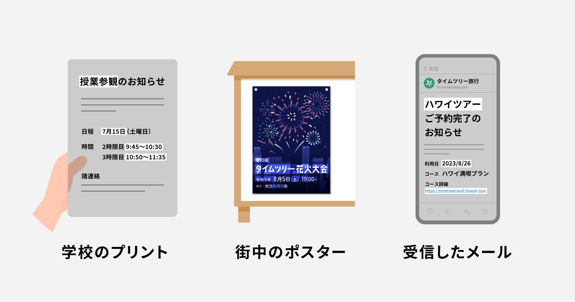 学校で配布された授業参観のプリント、街中に貼られたイベントのポスター、スマートフォンで受信したメールのスクリーンショットなど、様々な画像から予定データを登録することができます。