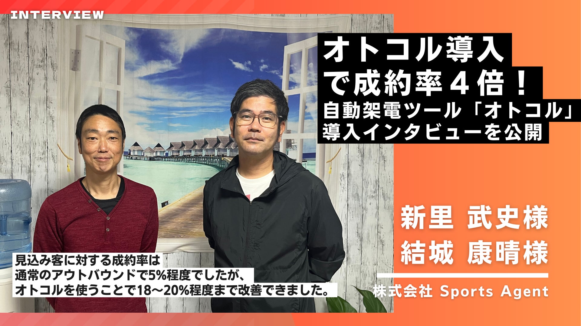 アイザック株式会社(本社:東京都渋谷区、代表取締役社長 田中 和希)は、株式会社スポーツエージェント(本社:沖縄県那覇市、代表取締役:宮里 判)に自動架電ツール「オトコル」を導入いただき、営業電話からの成約率が4倍まで向上したことをお知らせします。
