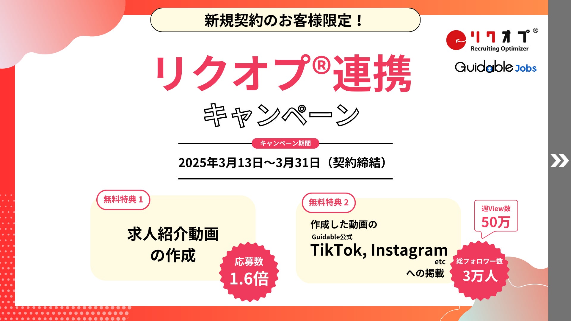 また、今回「リクオプ®︎連携キャンペーン」として、3月末までに「Guidable Jobs」を新規契約いただき、リクオプ連携機能をご利用いただいた企業を対象に、求人への応募数が約1.6倍が見込める「求人動画作成/掲載オプション」が無料でご利用いただけるキャンペーンを実施します。