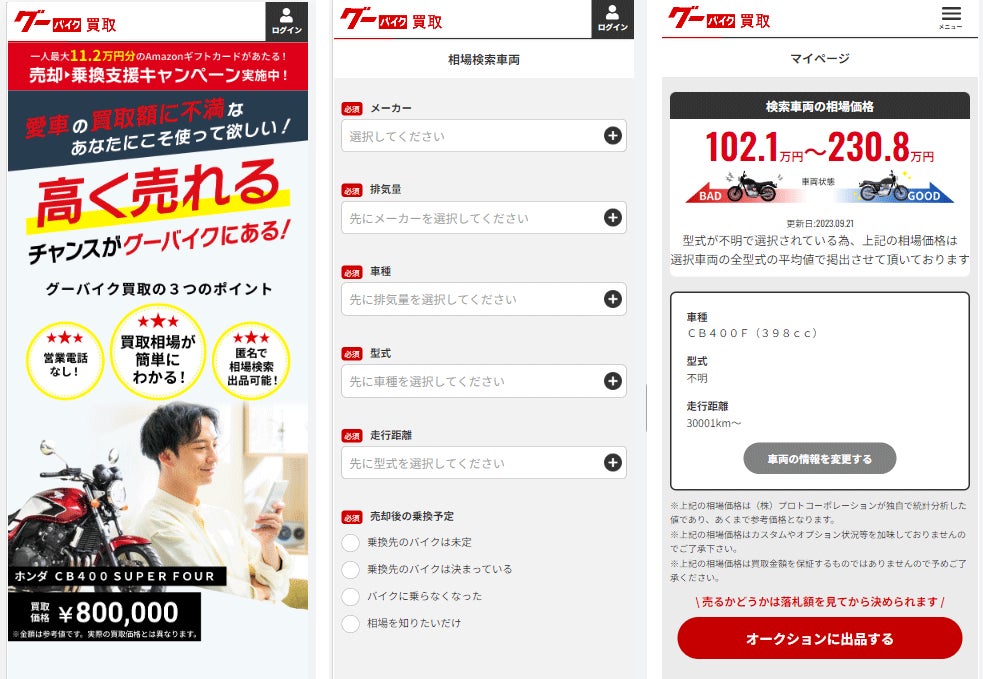 「グーバイク買取」は、自社メディアを活用した約2,400件のアンケート調査で見えてきた、Web経由のバイク買取サービスにおける不満点に注目し、使い易く経済合理性の高いサービス開発を目指しました。ユーザーが出品する際、「グーバイク」に掲載された膨大な中古車データから抽出、分析した買取価格相場が表示されます。ユーザーはバイクの買取価格相場を理解して出品・商談をすることができます。更に「グーバイク買取事務局」を設置し、ユーザーが売買成立までの手間の軽減、不安の解消のために事務局を介した商談をサーポートいたします。