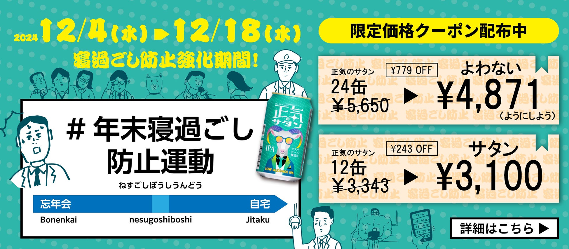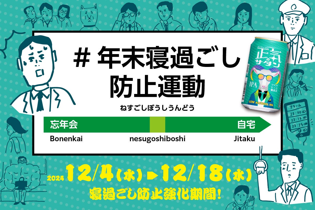 株式会社ヤッホーブルーイングは12月4日(水)より2週間、「お酒の飲みすぎによる電車での寝過ごし」に注目して適正飲酒を呼びかける「#年末寝過ごし防止運動」を実施します。飲酒機会の増える忘年会の時期に合わせて、アルコール度数0.7%の微アル飲料「正気のサタン」*1に置き換えることでアルコール摂取量を減らしお酒と楽しく付き合うことを呼びかけます。南栗橋駅(東武日光線)・森林公園駅(東武東上線)など都心からの終着駅7駅に全21種の寝過ごし防止を呼びかけるポスターを掲出するほか、軽井沢町「熊野皇大神社」ご祈祷済み「寝過ごし防止グッズ」が当たるSNSキャンペーンの実施と、通販で使える「正気のサタン」割引クーポンを配布します。