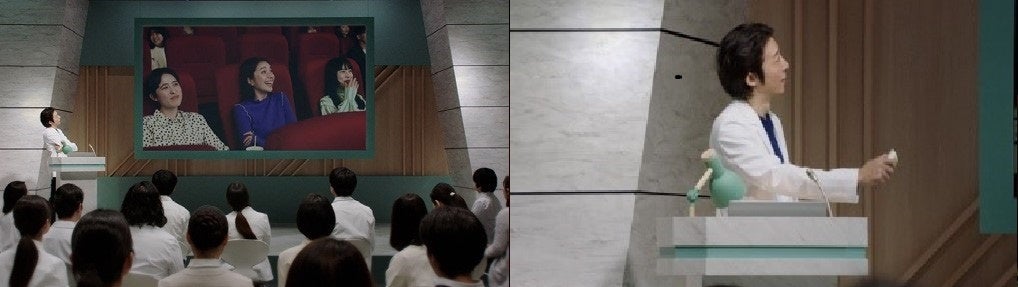 同じラボ内ですが、いつものスペースとは別の映写室が舞台の今回のCM。ビデオの操作や、モニターを指し示しながらの演技など、研究員たちへの課外授業という雰囲気を楽しんで演じられていました。
