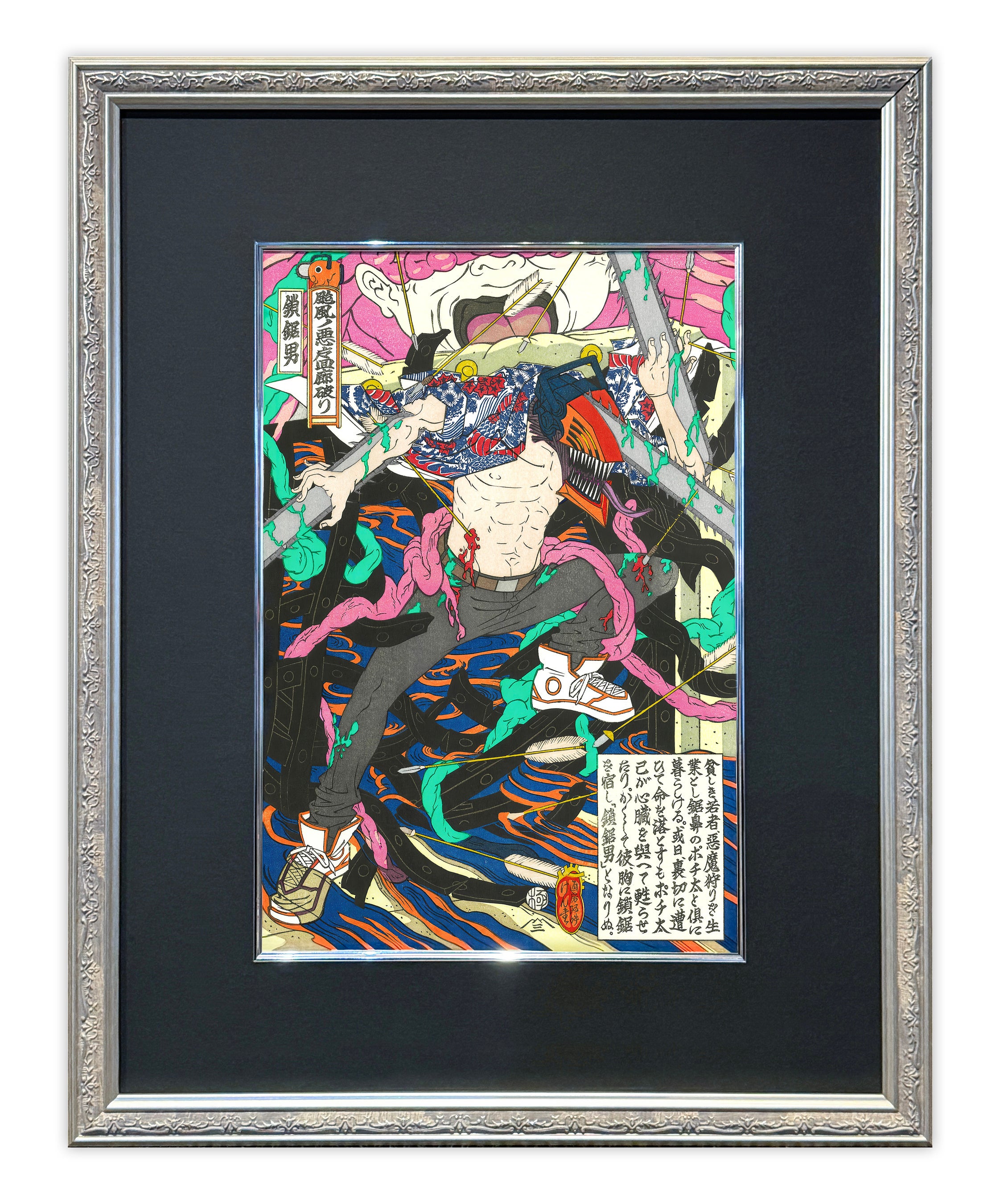 本企画は、江戸後期の鬼才浮世絵師・歌川国芳による代表作「通俗水滸伝豪傑百八人之一個 浪裡白跳張順」をベースに、『チェンソーマン』の世界観を融合させた浮世絵木版画作品です。
