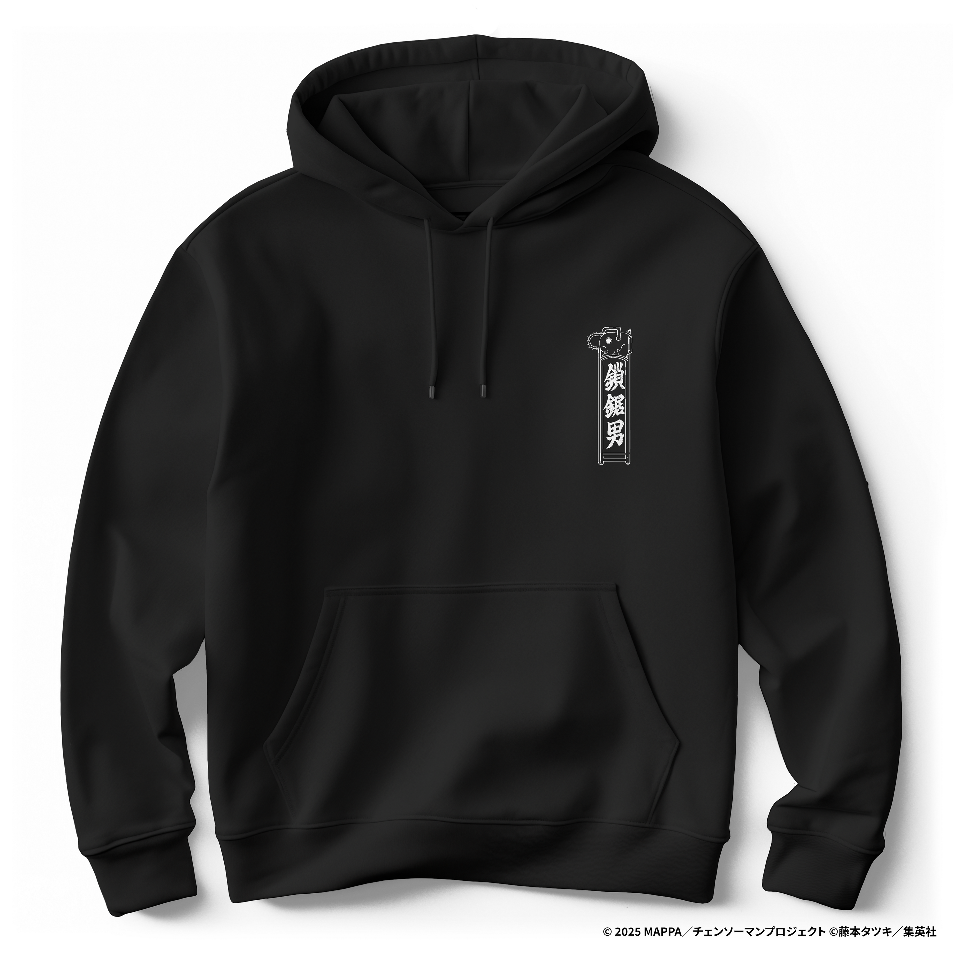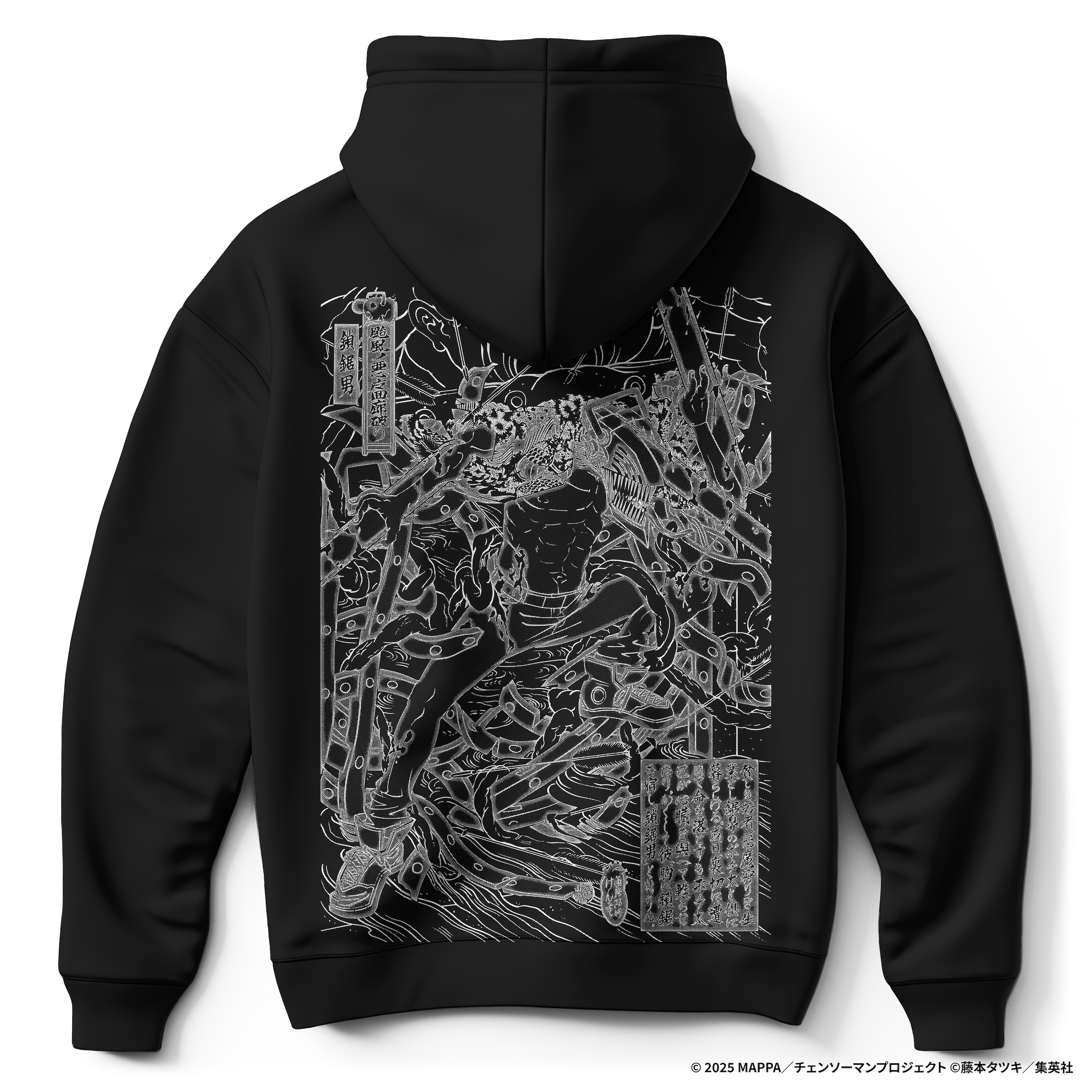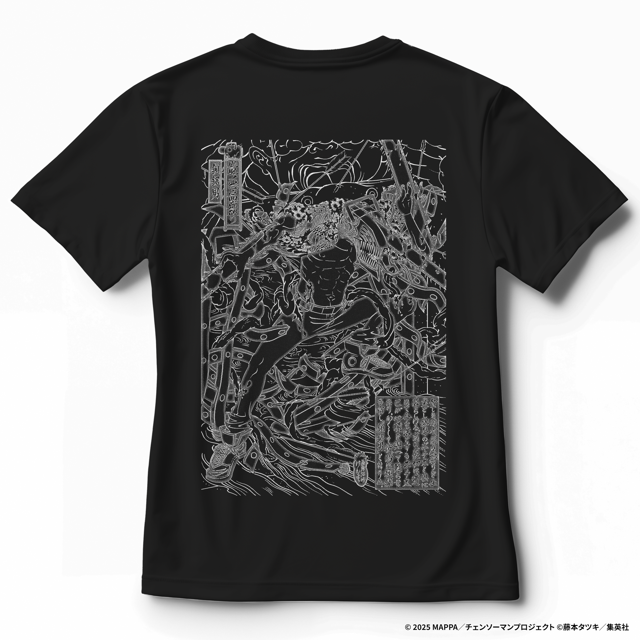 本商品は、シルクスクリーン印刷にて浮世絵の「墨線」と呼ばれる版木のラインを背面にプリントしています。フロントには浮世絵内で「チェンソーマン」を表現した「鎖鋸男」とポチタをデザインしています。