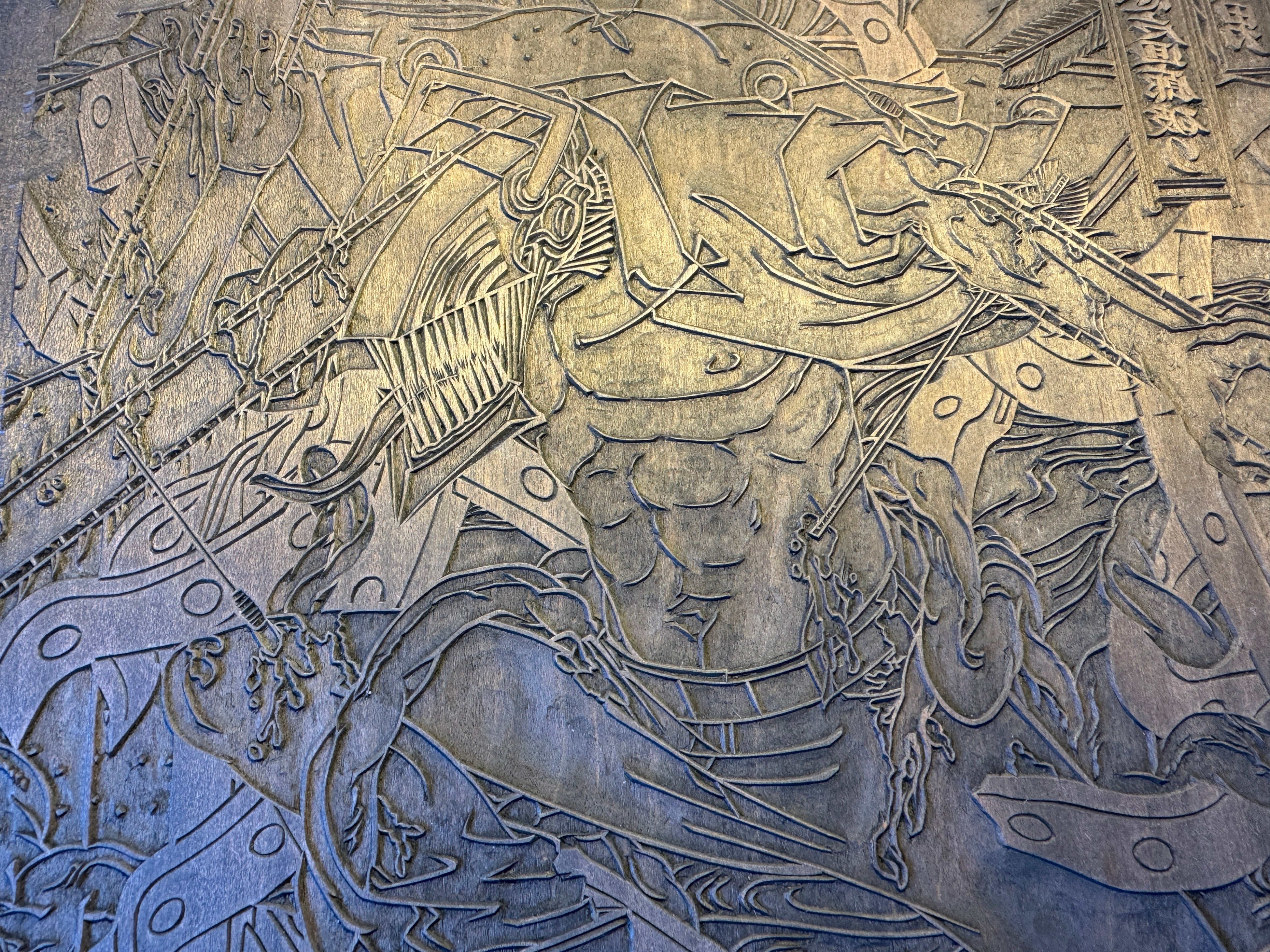 繊細に彫り分けられた版木、熟練の職人による幾度にも及ぶ手摺り。伝統的な顔料が生み出す深みある色彩と、血潮や刃の軌跡を想起させる大胆なビジュアル。その緊張感あふれるコントラストを、ぜひ間近でご鑑賞ください。