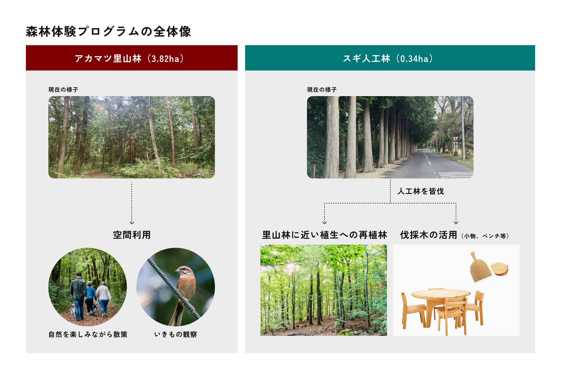 森未来は、栃木県那須塩原地域で活動する青葉組株式会社やたかはら森林組合と連携し、アカマツの里山林を活かした自然体験や、スギ人工林の活用および里山林に近い植生への再植林を行います。