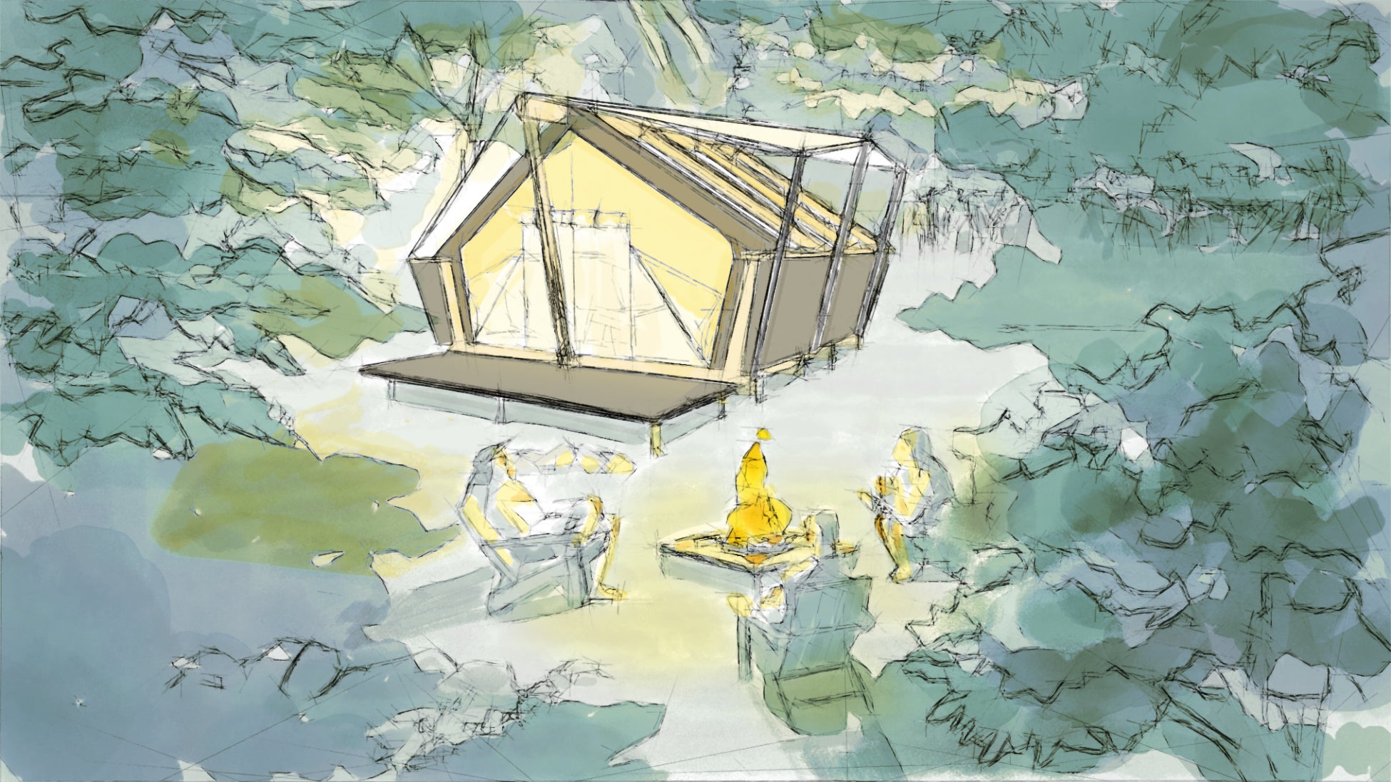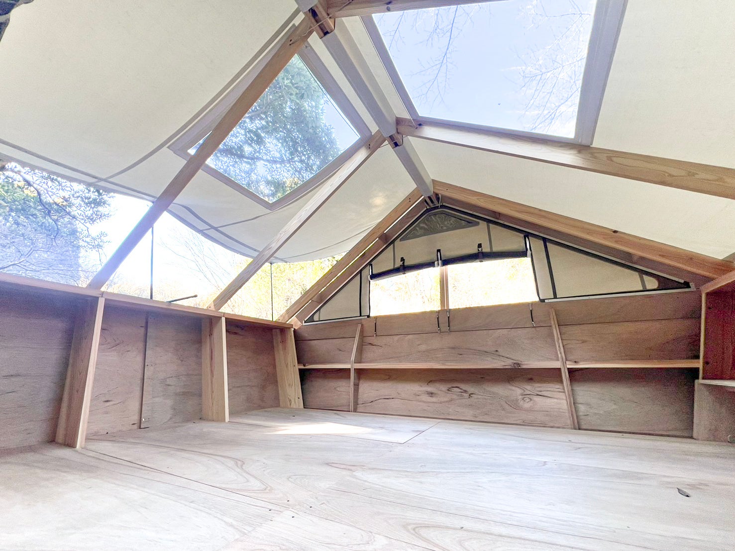全国20箇所のキャンプ場を運営し、利用者ニーズを熟知する株式会社Recampと、デジタル技術を駆使して、革新的な取組を行う設計集団VUILDが共同開発した「TENT★CABIN」は、テントの「自由」と 建物の「安心」の ちょうど間にあるような心地よさを追求。やさしい印象のしっかりとした木の構造と、大きく開く可動式の屋根からは空間のひろがりや自然とのつながりを強く感じることができます。