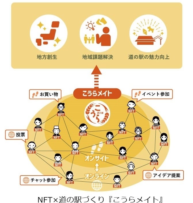 『こうらメイト』とは、昨今話題となっているNFT(Non-Fungible Token:非代替性トークン)※2技術を用いて、道の駅運営事業者と道の駅利用者の間や、道の駅利用者同士で気軽にコミュニケーションをとることを通じて、インターネット上のオンラインと現地でのオンサイトを融合させ、道の駅せせらぎの里こうらの魅力アップや地域が抱える社会課題の解決を目指す新しい取組みです。