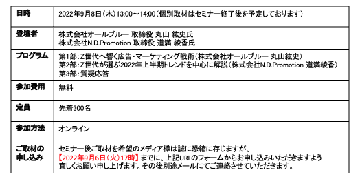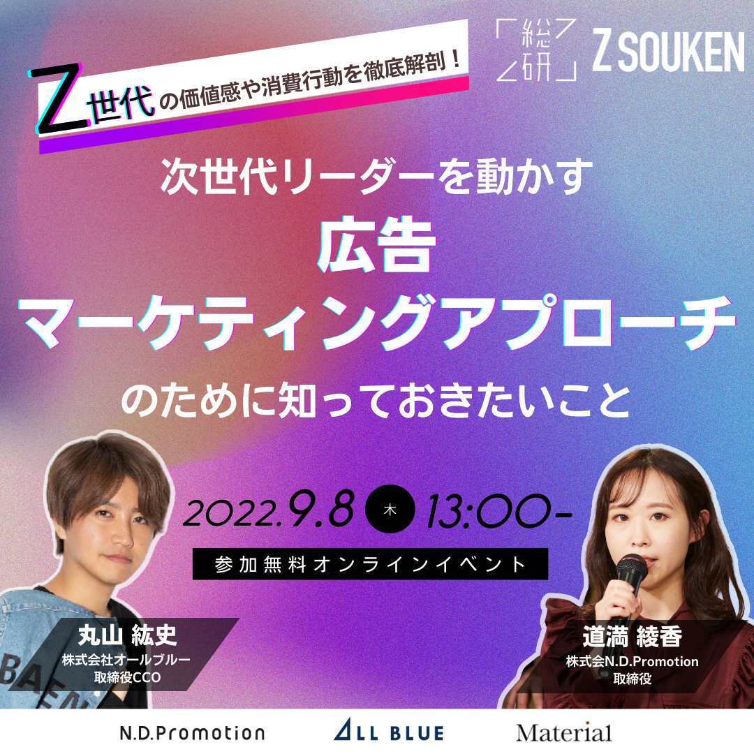 2022年9月8日(木)に、Z世代の価値観や消費行動について解説するオンラインセミナーを開催いたします。当日は「Z世代が選ぶ2022年上半期トレンド」や、これまでに『Z総研』が行った調査などを解説いたします。当日はオンラインでの開催ではございますが、セミナー終了後にはご取材のお時間を設けたいと考えておりますので、ぜひオンラインセミナーへのご参加・ご取材のご検討をよろしくお願いいたします。