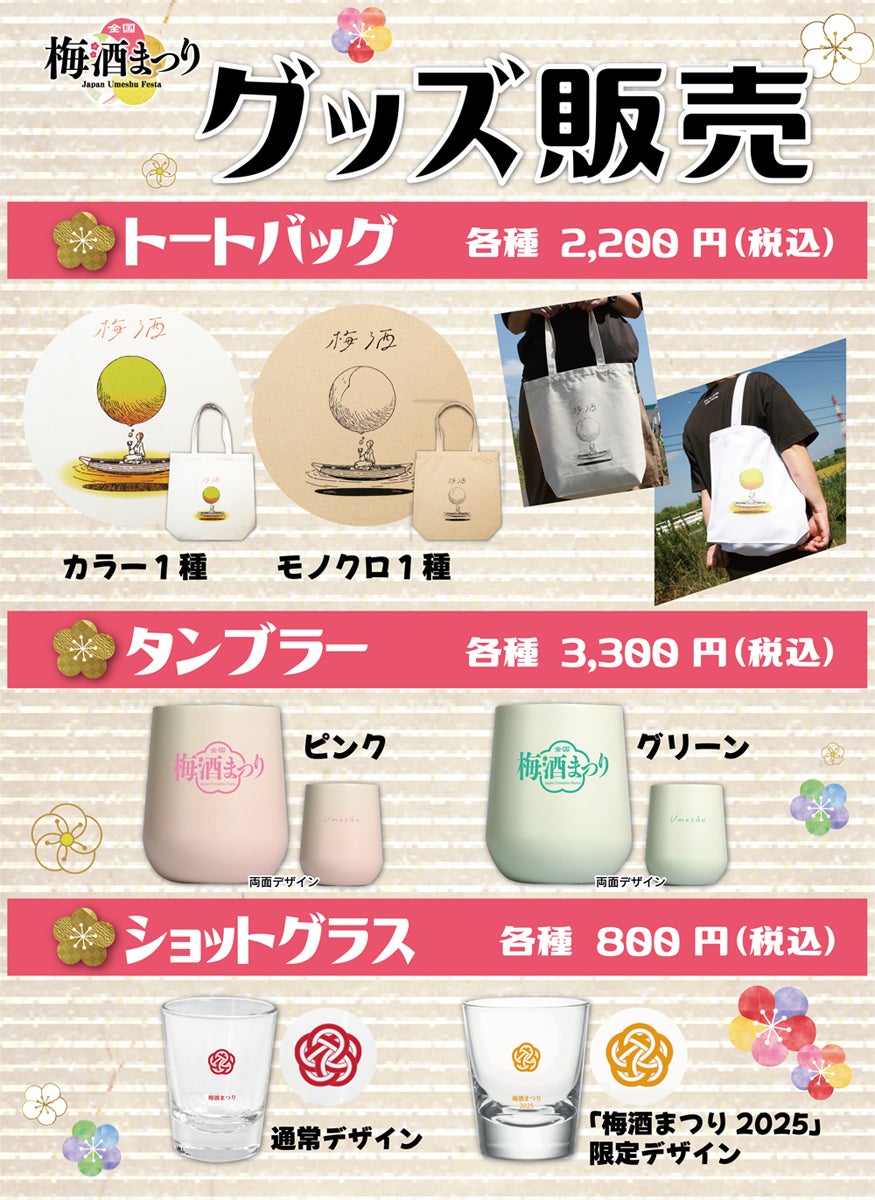 梅酒まつり会場でしか手に入らないオリジナルグッズを販売。即売会場で購入した梅酒を入れられるトートバッグ、ご自宅で梅酒を楽しめるタンブラーやショットグラスをご用意しました。全国梅酒品評会2024記念Tシャツも。