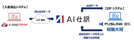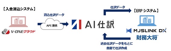 今回の連携により、『V-ONEクラウド』での入金消込の結果を、『MJSLINK DX 財務大将』に仕訳として直接取り込むことが可能となりました。『MJSLINK DX 財務大将』の「AI仕訳」機能により、過去の仕訳データと照合のうえ、自動で仕訳を作成します。ユーザーは、消込仕訳データを財務会計ソフトに転記する作業や勘定科目を選択する手間がなくなり、毎月の伝票起票の負担を大幅に削減することが可能となります。