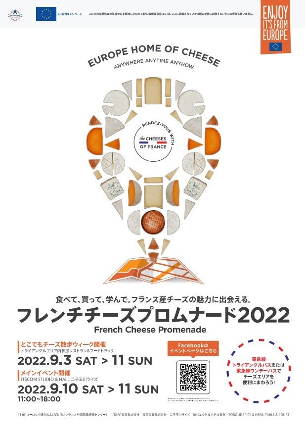 CNIEL(フランス全国酪農経済センター以下CNIEL)ならびにヨーロッパ連合は、2022年9月3日(土)~9月11日(日)の9日間、消費者向けイベント「フレンチチーズプロムナード2022」を渋谷・自由が丘・二子玉川エリアで開催いたします。