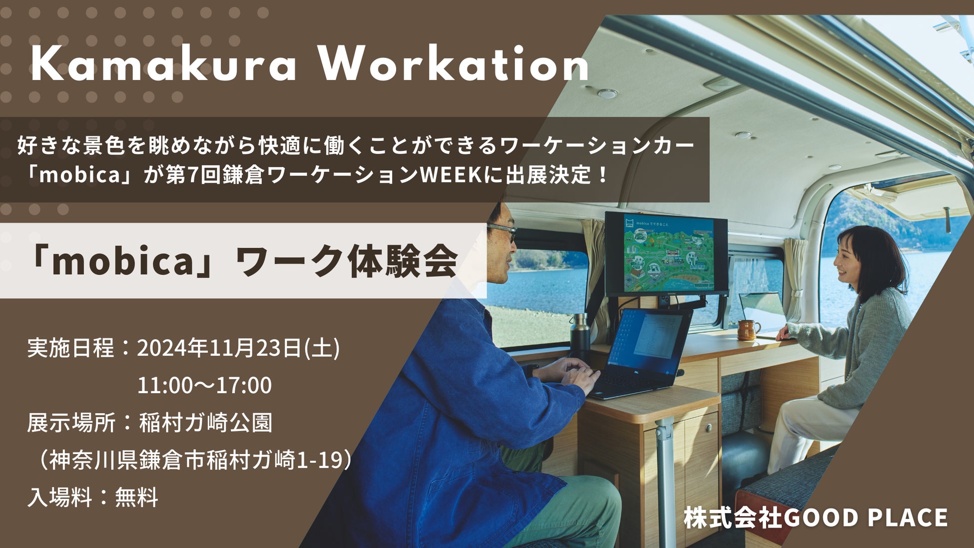 建物のリノベーション、オフィス構築、バックオフィス業務のアウトソーシングを通じて「より良い場」を創造する建築会社の株式会社GOOD PLACE(旧株式会社コスモスモア、本社:東京都渋谷区、代表取締役社長:枝廣 寿雄)は、2024年11月20日(水)から11月23日(土・祝)に開催される「第7回鎌倉ワーケーションWEEK」の最終日限定で、当社が展開するカーシェアリングサービスのワーケーションカー「mobica(モビカ、以下mobica)」を出展いたします。
