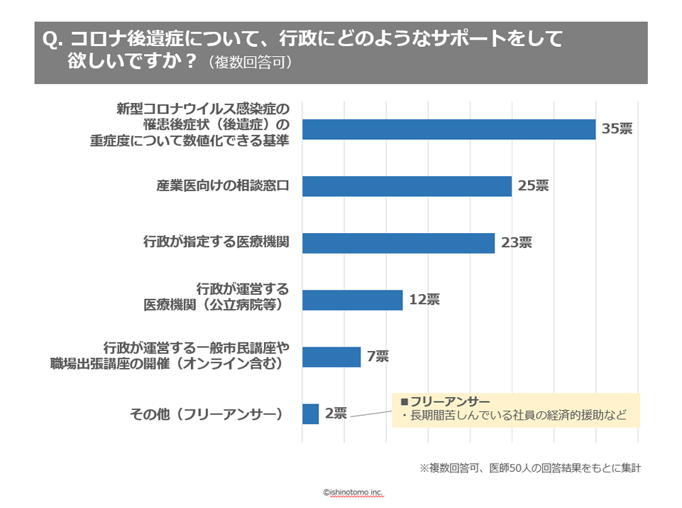 また、アンケート回答50名のうち25名(50%)の産業医が「行政による産業医向けの相談窓口」を求めていることがわかりました。