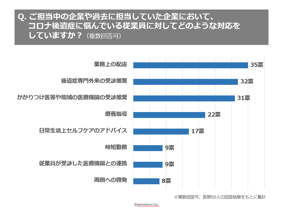 ご回答いただいた産業医50名のうち35名(70%)が、コロナ後遺症である企業従業員対応において「業務上への配慮」が必要と回答しました。