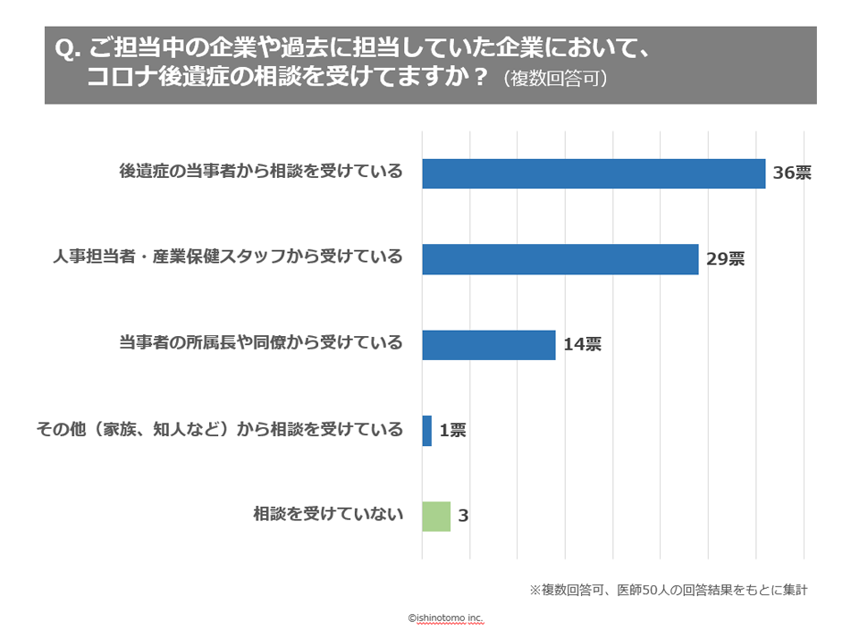結果、ご回答いただいた産業医50名のうち47名(94%)が「何かしらのコロナ後遺症について相談を受けている」ことがわかりました。