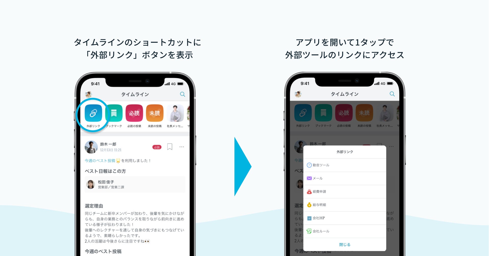 ・個人所有のスマートフォンでも、TUNAGモバイルアプリのタイムラインから勤怠、給与明細、マニュアル等の外部ツールに簡単かつスムーズにアクセスできます
