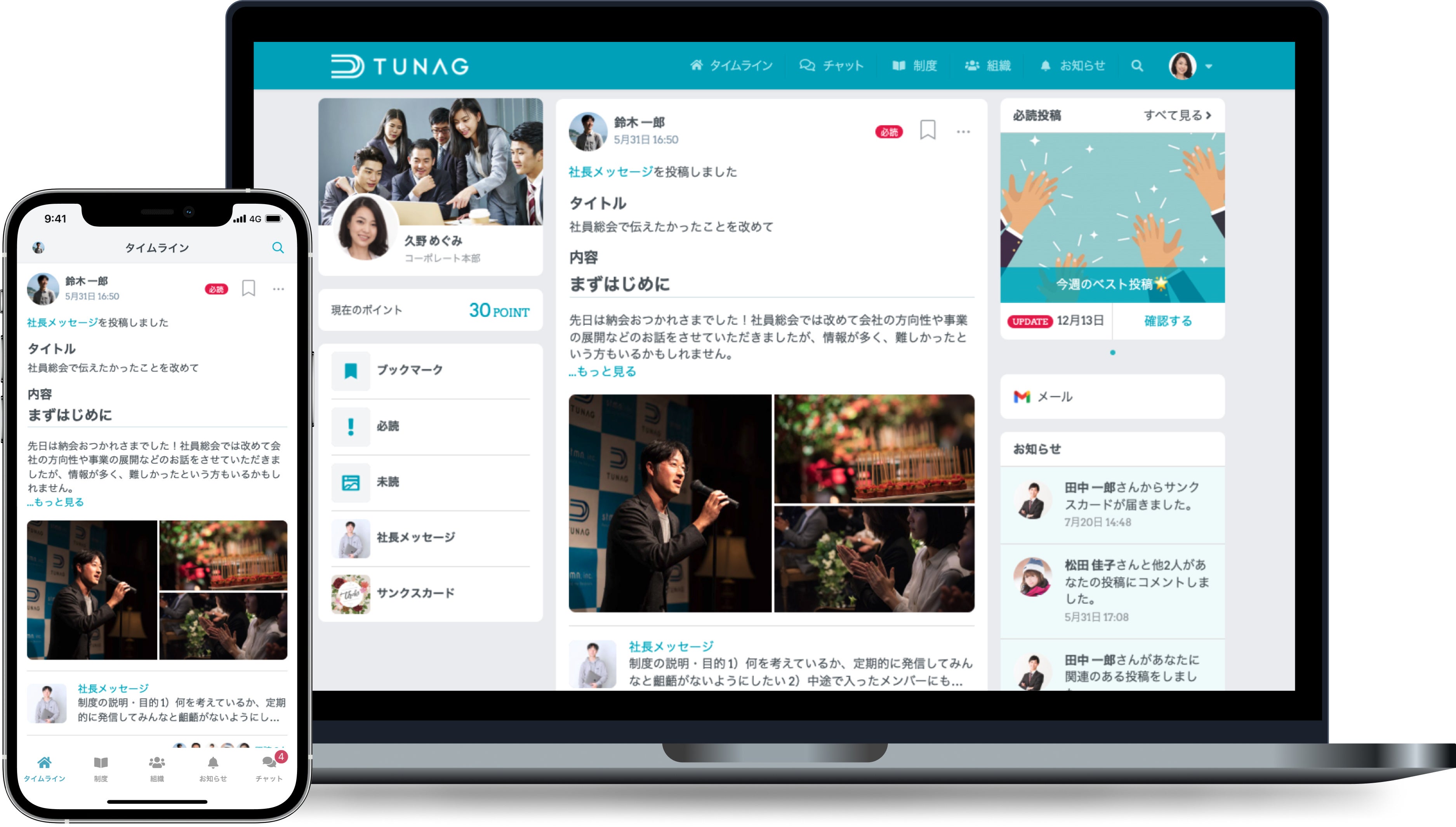 TUNAGは、企業の生産性向上や離職率の低減などを目的に、社内のDX推進および、従業員エンゲージメント(=企業と従業員、従業員同士の信頼関係)を向上させるために開発されたITサービスです。
