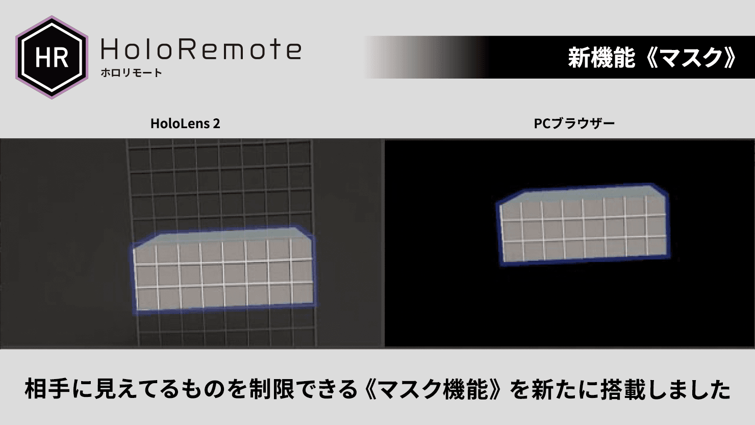 安全対策必須な現場でも安心して遠隔支援が可能になりました!「HoloRemote」の新機能にマスク機能を搭載です。遠隔支援時は、社内外を映像でつなぎます。その際に心配になるのは「セキュリティ」。「HoloRemote」を使用した遠隔支援のときの映像送信では「支援が必要なところだけを見せたい。他は隠したい」というニーズを反映して「マスク機能」が追加されたため、安心して支援ができるようになりました。