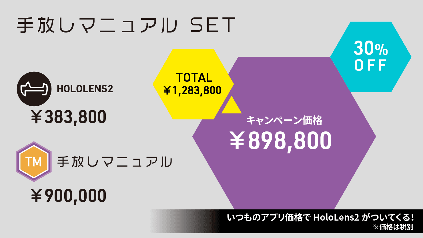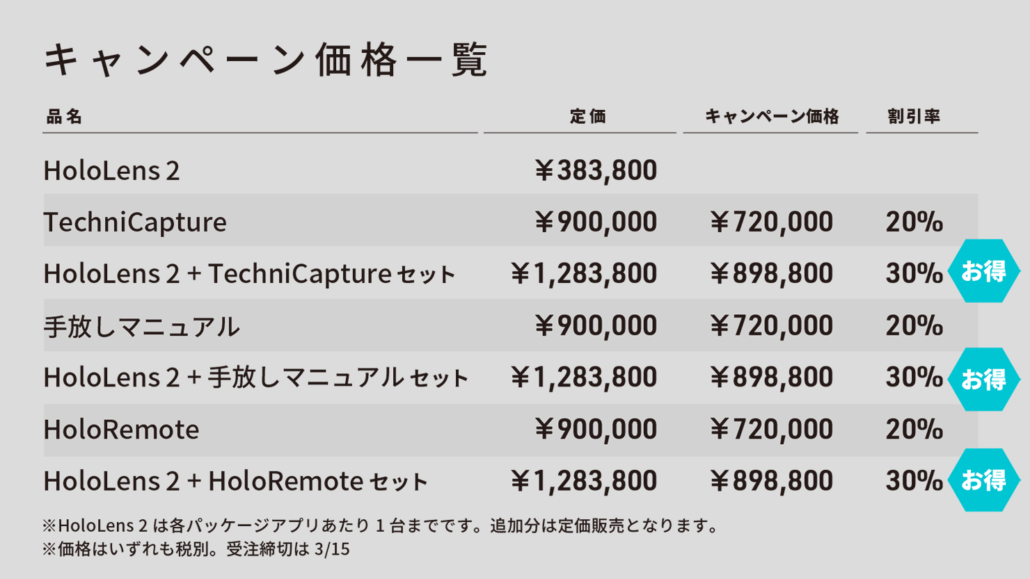 - HoloLens 2とのセット購入については各パッケージアプリ1ライセンスに対して1台までが対象 (HoloLens 2のみのご購入は対象外)