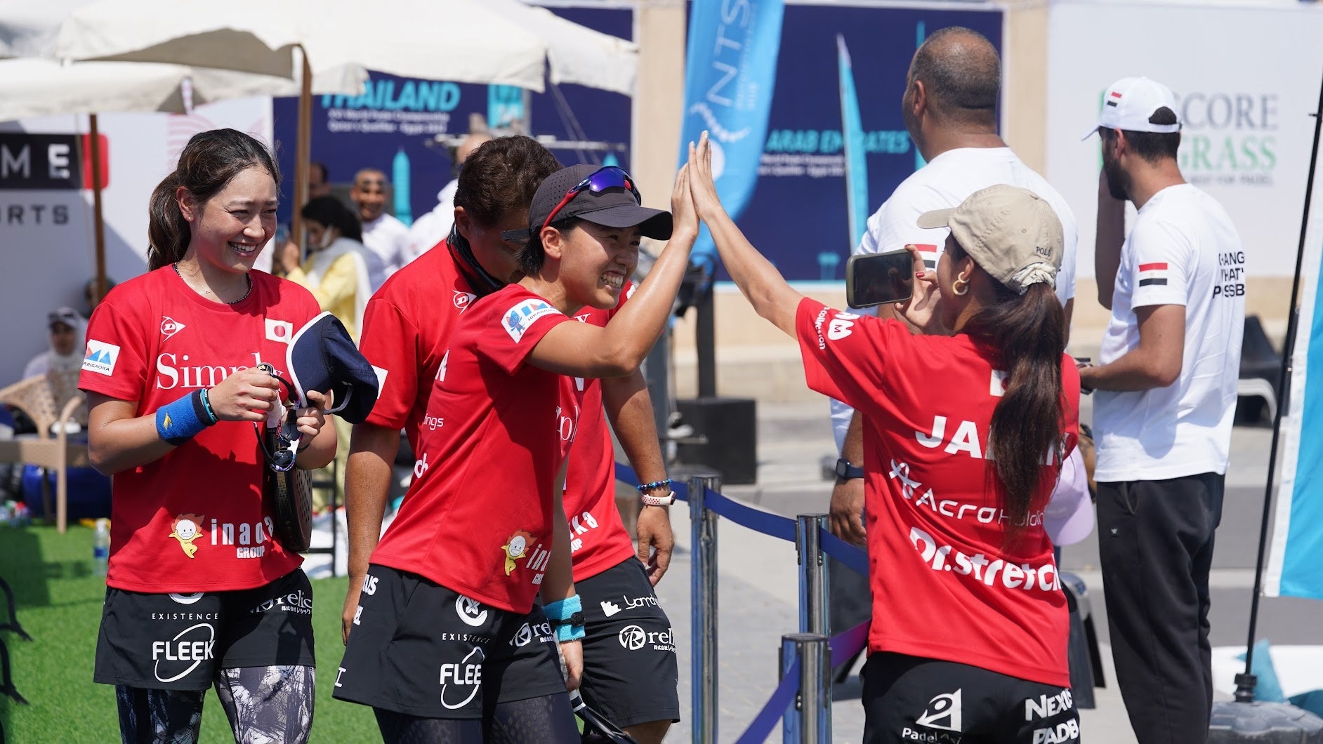 初戦の富田・平ペアの対戦相手はアジアでも有数の強敵で、抜群の安定感とパワー、戦術で自分たちのやりたいプレーが出来ず、完敗となった。後がなくなった日本チームは、冨中・畠山ペアが安定感を取り戻し、6-4,6-1で取り戻した。またしても、1勝1敗で巡ってきた中村・日下部ペア。1stセットは日下部選手のディフェンスと中村選手のスピードで押し切り、6-4で1stセット先取。しかし2ndセットから相手がプレースタイルを変えてきて、対応しきれず0-6でファイナルセットへ。負けたら終わりという状況のなか、男子チームのスローガンである「一球入魂」で自分たちのプレーを取り戻し、6-4で辛勝した。オーストラリアvsUAEでオーストラリアが勝利したため、日本は何とか予選2位で決勝トーナメント進出を決めた。