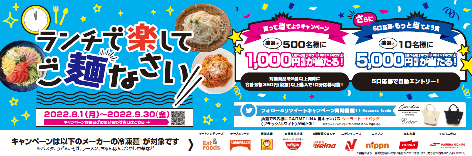 株式会社日本アクセス(所在地:東京都品川区、代表取締役社長:佐々木淳一)は、2022年8月1日(月)より冷凍麺販促企画『ランチで楽してご麺なさい』を実施いたします。