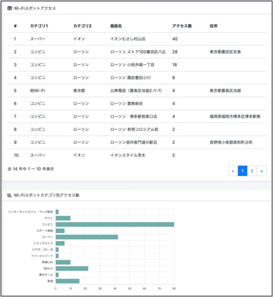 Wi-Fiスポットアクセスレポートは、どこどこJPマーケットプレイスで販売されているWi-Fiスポット情報を用いたアクセスレポートを閲覧できる機能です。どこどこJPを利用したIPアドレスが、Wi-Fiアクセスポイントで利用されているIPの場合、どういった店舗や施設からのアクセスが多いかを把握することができます。このアクセスレポートは、指定したメールアドレスへ自動配信することができます。