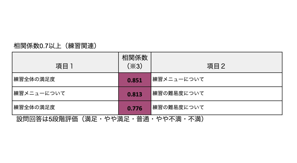 強い相関とは項目1の評価が高いほど、項目2の評価が高い傾向にあることを示しており、下の例では、「練習全体の満足度」の評価が高いほど「練習メニュー」の評価が高いことを示しています。