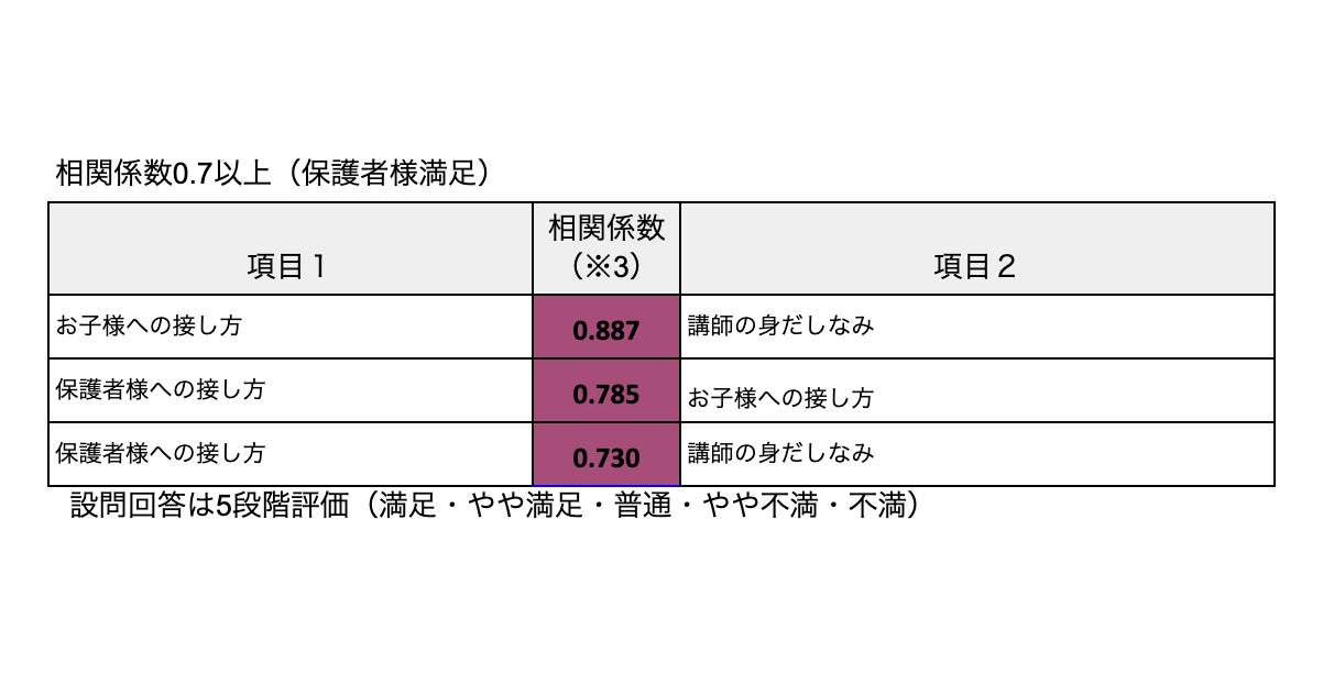 「講師に関するアンケート」においては、「お子様への接し方」では、満足・やや満足の回答合計が8割以上(88.4%)でした。「講師に関するアンケート」の各項目について、相関分析(※2)を行ったところ、「お子様への接し方」と「講師の身だしなみ」「保護者様への接し方」、「講師の身だしなみ」と「保護者様への接し方」で、強い相関が見られました。