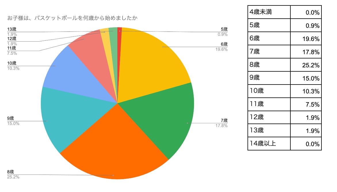 お子様のバスケットボールを始めた年齢は、6歳のタイミングで急増していることが分かりました。また、8歳までに63.6%のお子様がバスケットボールを始めているという結果が出ており、小学校低学年のうちから神戸ストークスバスケットボールスクールではお子様がバスケットボールを始めていることがわかります。