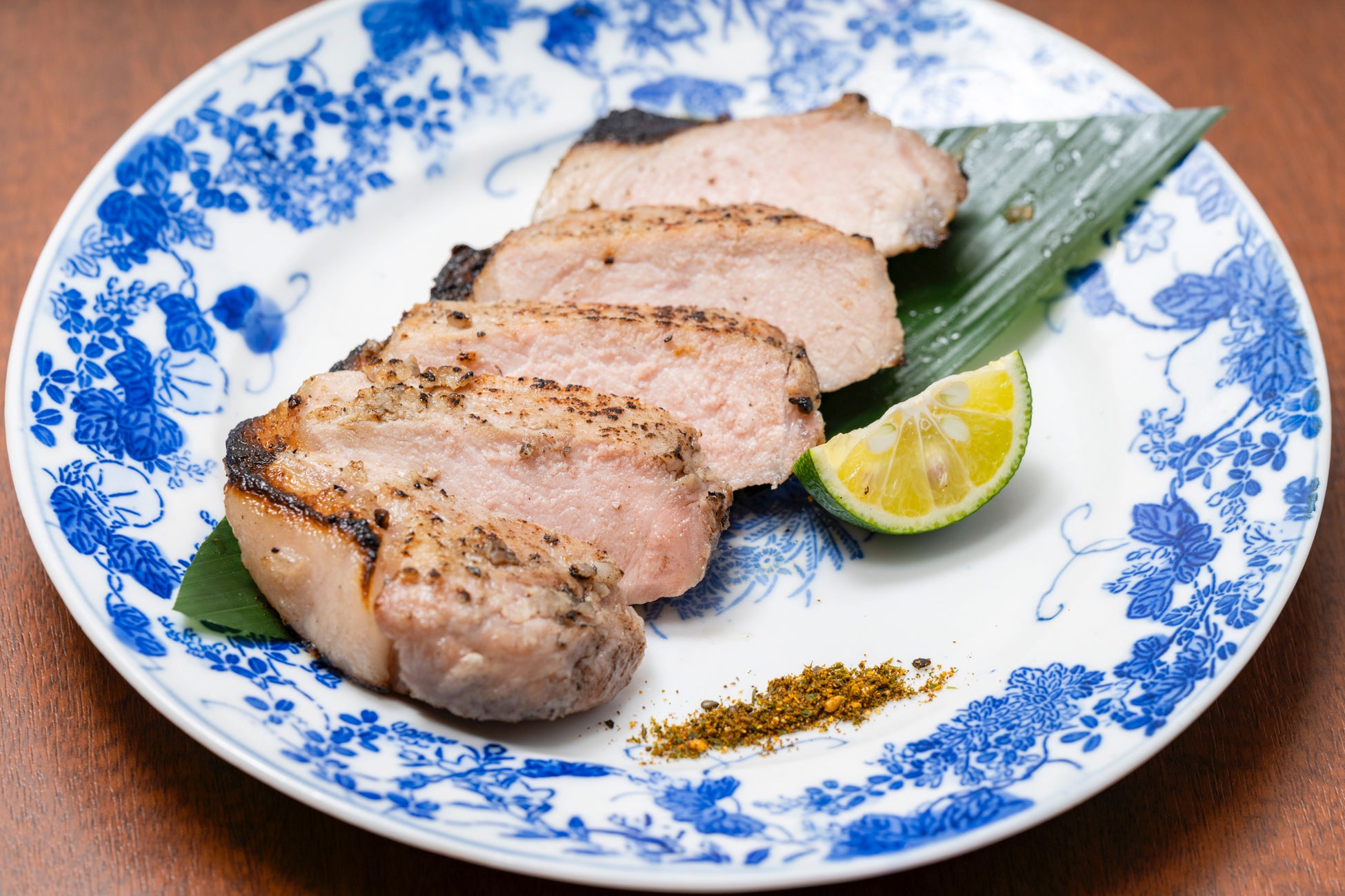 京都のブランド豚「京都ぽーく」を塩麹漬けにし、炭火でじっくりと焼き上げた逸品。