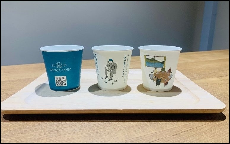 ・コワーキングスペース「A-Point」にて、ワーケーション推進を促すメッセージ入りの紙コップを配布