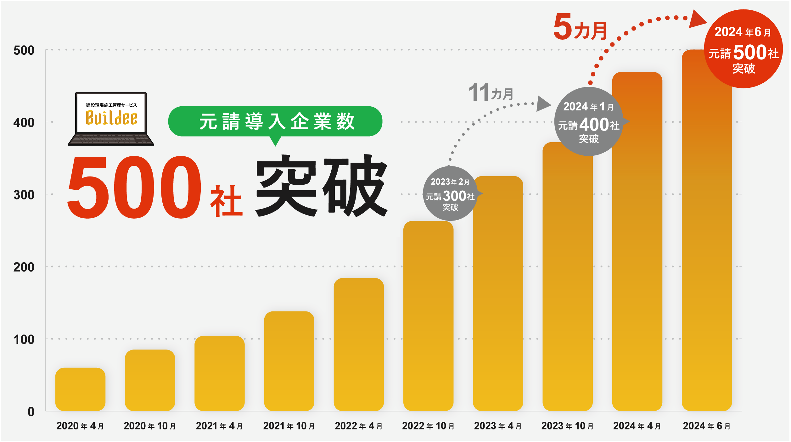株式会社リバスタ(本社:東京都江東区、代表取締役:高橋 巧、以下 当社)が提供する「建設現場施工管理サービス『Buildee(ビルディー)』」を導入した元請会社数が、2024年6月末に500社を突破しましたのでご報告いたします。建設業界では「2024年問題」における働き⽅改⾰と⽣産性向上が求められる中、「Buildee」の導入社数は、2024年1月に400社を突破した後、さらに100社の企業に新たに導入され、導入社数の増加ペースが加速しています。