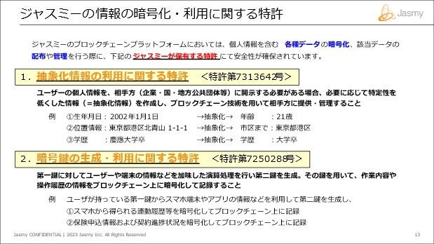 (4) 見舞金や情報提供料の給付には、PDL内に発行された権利証により、なりすましや改ざん等のリスクを低減しつつ、ブロックチェーン上のスマートコントラクト技術を活用したシームレスな支払いの実現を目指しています。加えて、ジャスミーが持つマイナンバーカード認証も可能にする本人確認の仕組みを使用することで、本プロジェクト参加者へより確実で安全な給付を実現いたします。