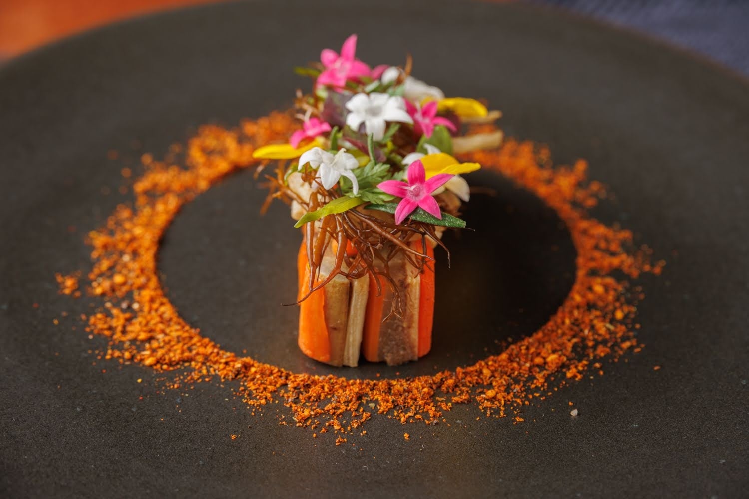 大地の恩恵をいっぱい受けて育った根菜を使ったミルフィーユ。にんじん、れんこん、ごぼう、りんごをプレスして重ね、間には玉ねぎとマッシュルームのピューレを挟み込んでいます。周りには、のり、大葉、すりごま、パプリカ、玉ねぎ、マッシュルームで作ったオリジナル七味を太陽をイメージして散りばめた、自然との共存を感じていただく盛付をお楽しみください。