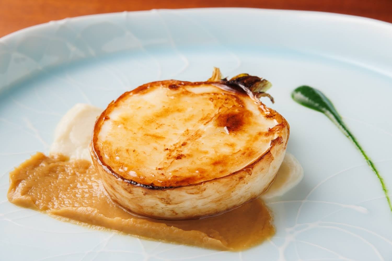ステーキにした大きめの蕪に添えられているピューレは3種。白色は甘味を、クリーム色は焦がした苦みを、グリーンは葉っぱを使い、濃いめの味付けをすることで薬味にし、蕪の全てを食べ尽くしていただけるように仕上げました。