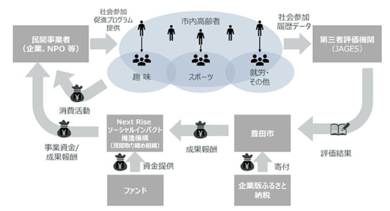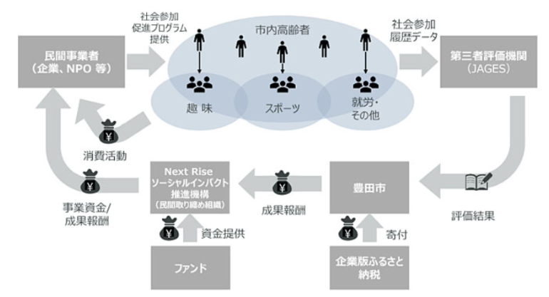 ソーシャルインパクトボンド(SIB)を用いて、高齢者の将来的な要介護・要支援認定リスクを低減し、豊田市における介護費削減を実現する。