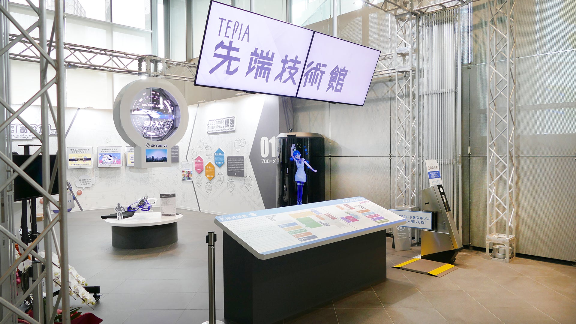 「Gatebox Grande」は「TEPIA 先端技術館」の入口にて来館者の皆さまをお迎えして、逢妻ヒカリが館内のデジタルアテンダントについてご案内いたします。