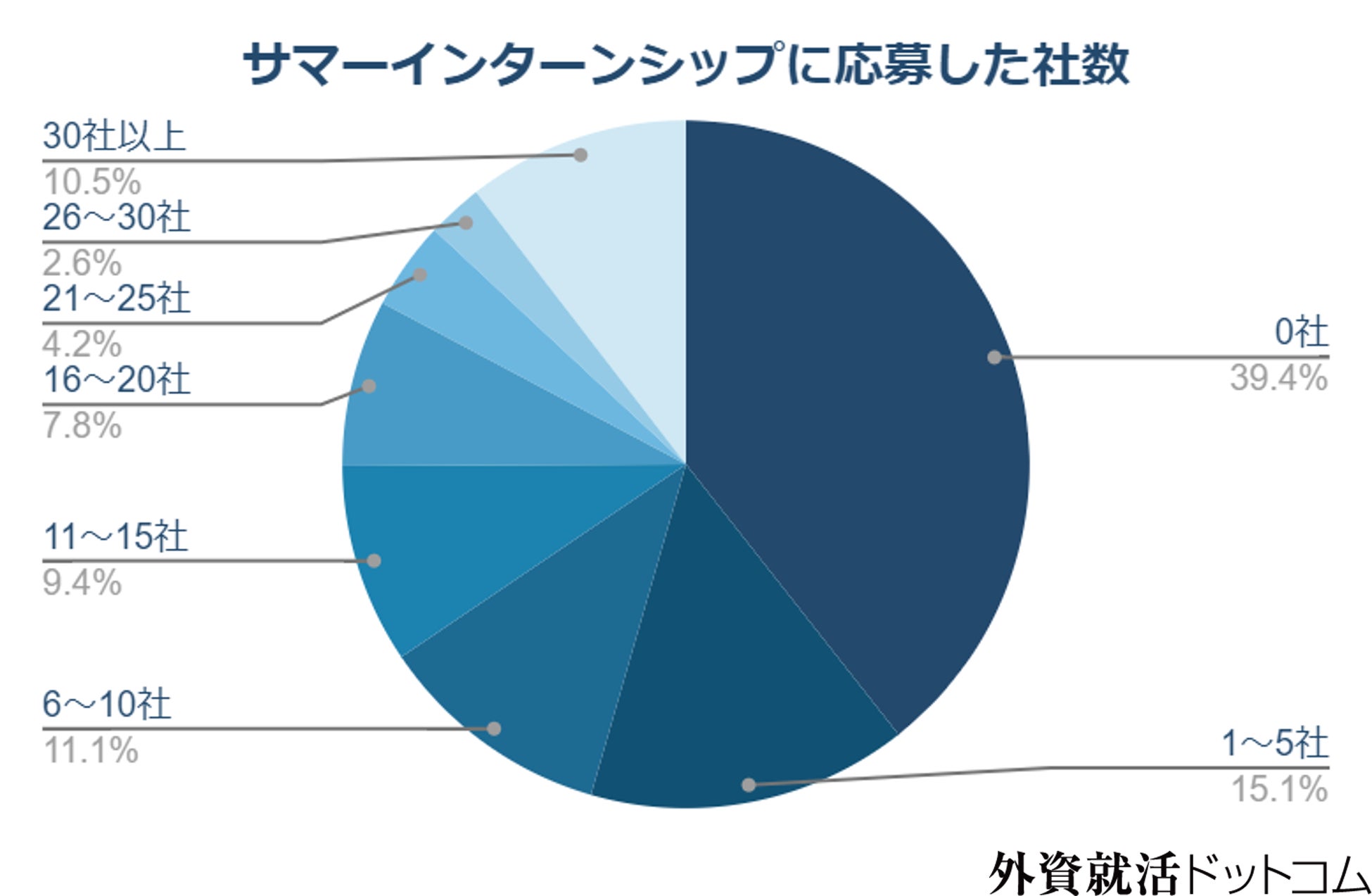 コンサル業界や外資系企業を志望するにあたって、もはや「本選考」の一部となっているサマーインターンシップ。応募した社数を聞いたところ、0社が39.4%と一番多い回答となりましたが、30社以上応募した人も10.5%と4番目に高く、就活生の動きが2極化しているとわかります。