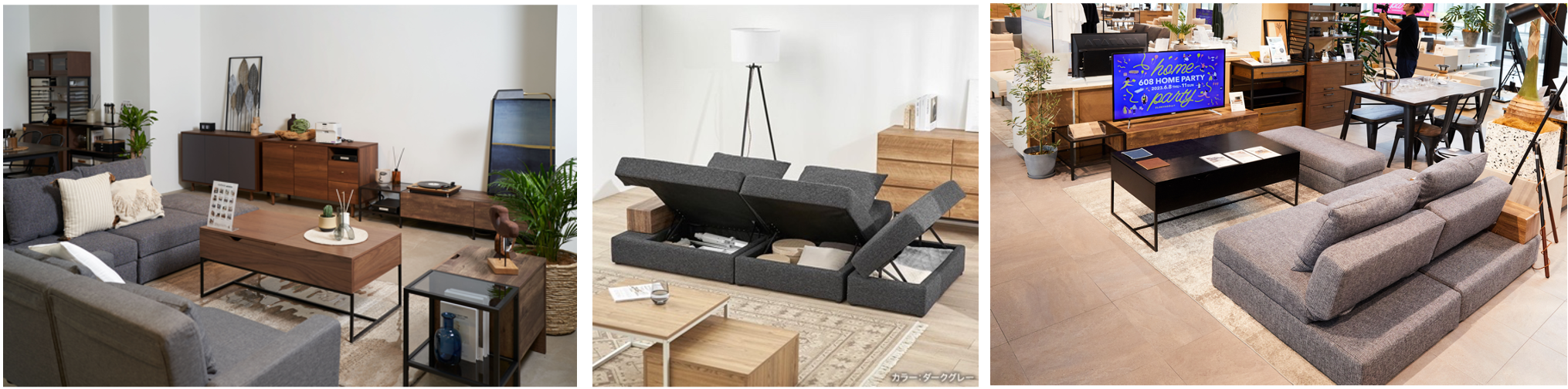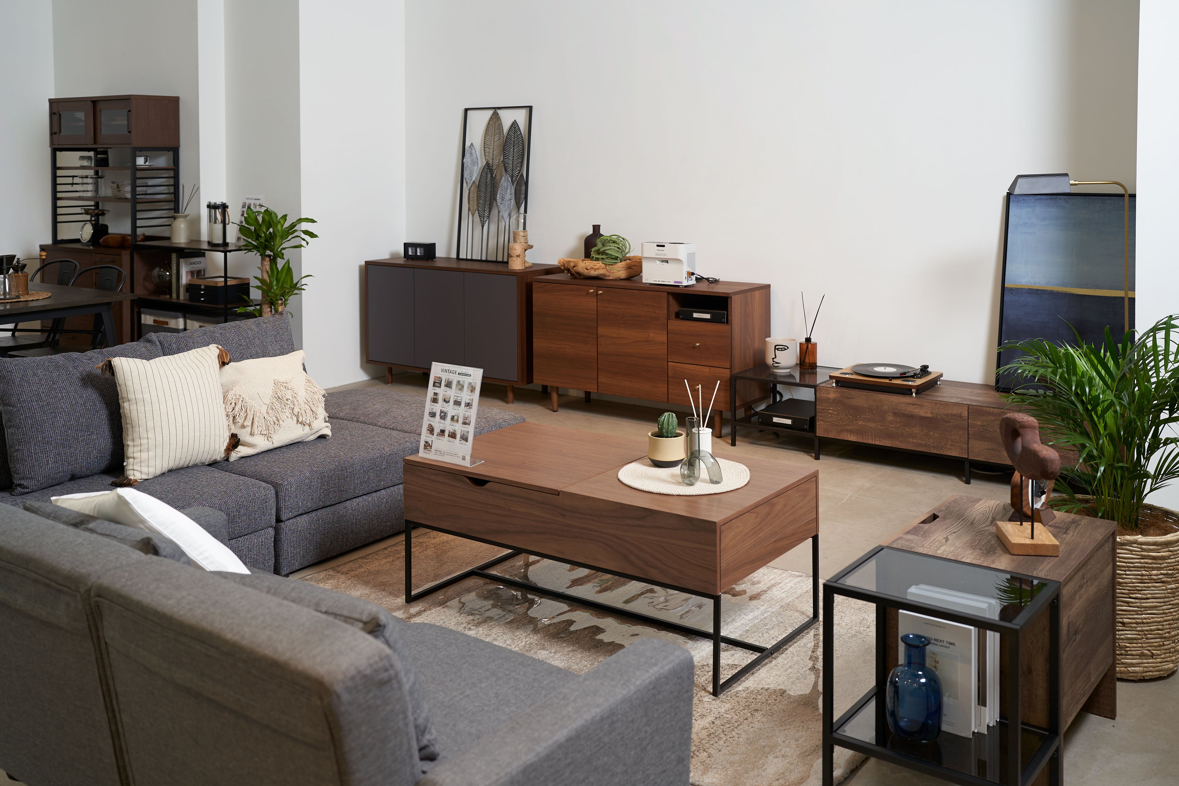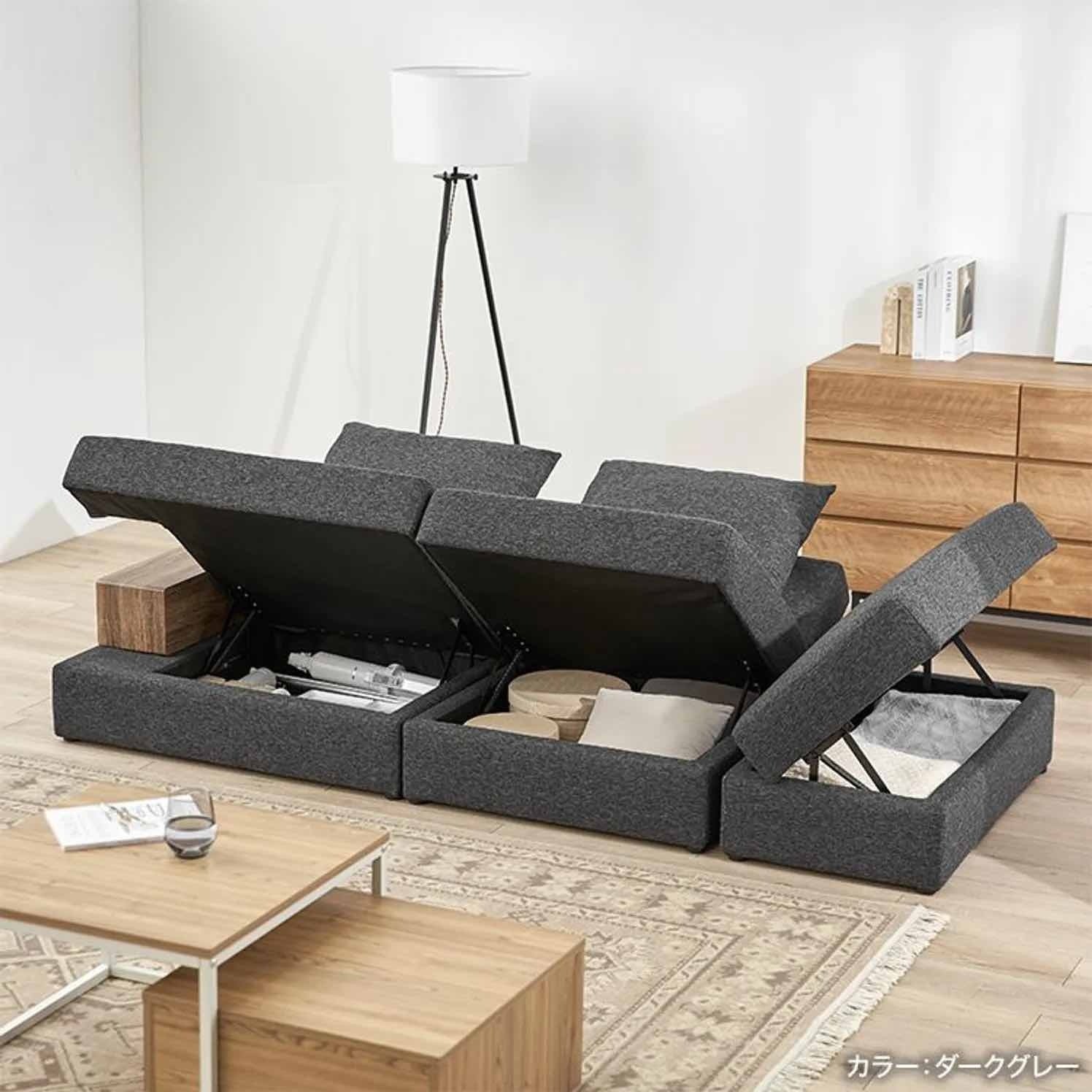 さて、数あるコーデやアイテムのなかでも注目を集めていたのは、モダンとノスタルジックなエッセンスの調和が心地よい「VINTAGE」コーデのエリアに設置された、「カウチソファ/¥ 69,990(税込)https://www.low-ya.com/goods/F202_G1013」。一見、ごく普通〜なソファに見えるものの…なんと!座椅子の下には、すべて隠れた収納エリアを持っている“神アイテム”ではないですか…!