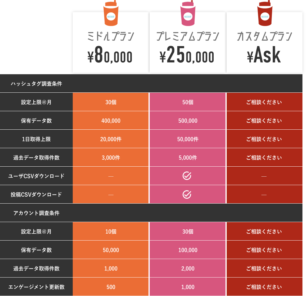 お客様によって弊社サービス活用方が多種多様になっている現状に対応出来るようプランを追加し、ご要望に添えるようにいたしました。また、各社自由にカスタマイズ可能なカスタムプランも用意させていただき、様々なSNSマーケティングやハッシュタグキャンペーンに対応。