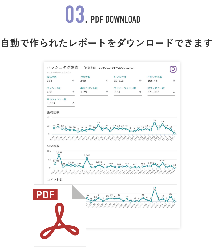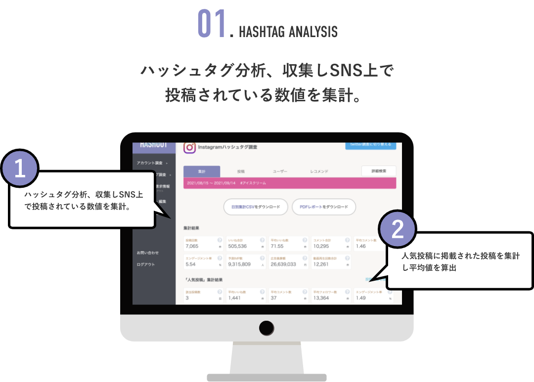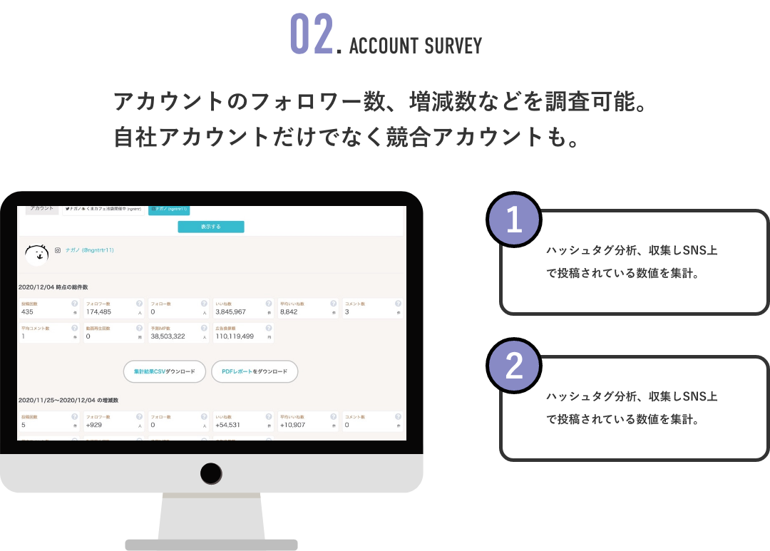 Instagram/Twitterでのフォロワー獲得の推移や「いいね」数などを計測するアカウント調査およびハッシュタグの集計が可能なツールで、ハッシュタグキャンペーンの効果検証、過去に使用されたハッシュタグの集計、競合他社の実績調査など、SNSマーケティングの様々な場面で活用でき、現在までに1000社以上の企業様にご利用いただいております。