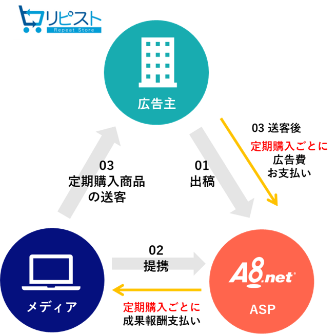 「リピスト」および「A8.net」を同時に導入されている広告主の定期継続購入商品やサービスを「A8.net」のメディアが消費者に紹介・送客した際に、その定期継続購入分すべてに成果報酬が発生するよう設定をすることが可能となります。