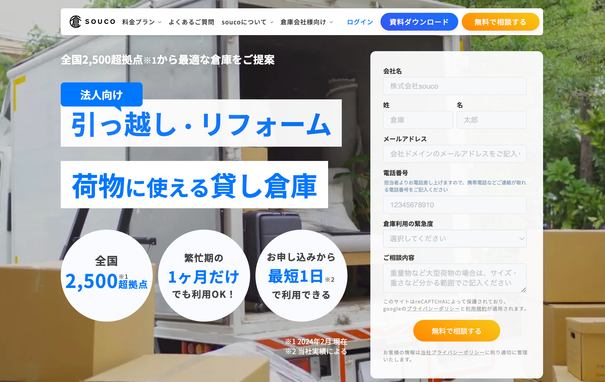 souco社は、国内最大級の倉庫ネットワークを活用した倉庫シェアリングサービス「souco」を提供しています。2024年2月現在、倉庫拠点登録数は2,500を超えて増加、短期利用、小口利用に加え、柔軟な物流網の設計を目的とした倉庫のご利用ニーズにもお応えしています。