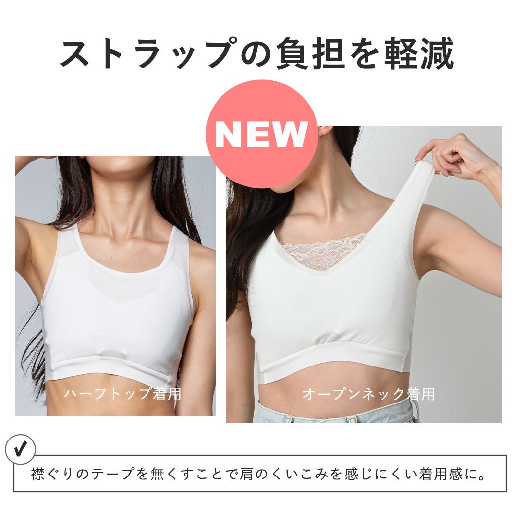 くいこみが気になるとのお声があったハーフトップブラのストラップ部分は、バストをしっかり支える作りになっているため、長時間の着用がきついと感じる方も。襟ぐりのテープを無くすことで、ちらっとみえても下着感がなく、肩への圧も強すぎない、長時間着用でもさらに肩のくいこみを感じにくい着用感に。