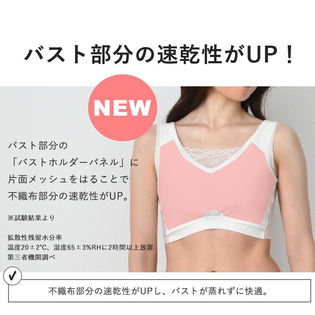 バスト部分の「バストホルダーパネル」に片面メッシュをはることで不織布部分の速乾性がUP。バスト部分が蒸れずにサラッと快適にアップデートしました。